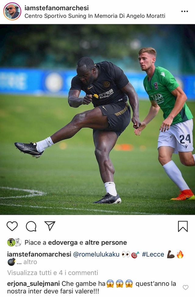 In tanti, in questi primi giorni di Inter, hanno avuto modo di apprezzare il fisico travolgente e impetuoso di Romelu Lukaku. L'attaccante belga sta impressionando tutti, pronto a diventare il nuovo idolo del popolo interista. Potenza pura. Del resto, Antonio Conte lo ha voluto (anche) per questo. E i dettagli fisici, soprattutto delle gambe, dell'ex Manchester United non sono sfuggiti nemmeno a Erjona Sulejmani, modella ed ex moglie di Blerim Dzemaili, centrocampista del Bologna. Il pr di Lukaku ha postato una foto mentre è intento a calciare un pallone nell'amichevole contro il Rozzano, mettendo così nel mirino il Lecce (come da didascalia), e la bella Erjona si è lasciata andare a questo commento: "Ma che gambe ha. Quest'anno la nostra Inter deve farsi valere!!".