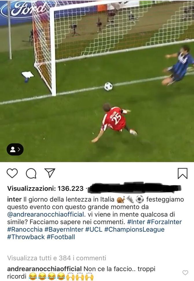Oggi l'Inter festeggia la Giornata Internazionale della Lentezza. Per farlo la società nerazzurra ha scelto il salvataggio sulla linea di Andrea Ranocchia nella partita di Champions contro il Bayern Monaco, stagione 2010/11, gara vinta 3-2 con gol di Pandev nei minuti finali. Un ricordo che ha scatenato la nostalgia del difensore nerazzurro: "Non ce la faccio...troppi ricordi", ha scritto il giocatore citando una frase di Giovanni del trio Aldo, Giovanni e Giacomo.