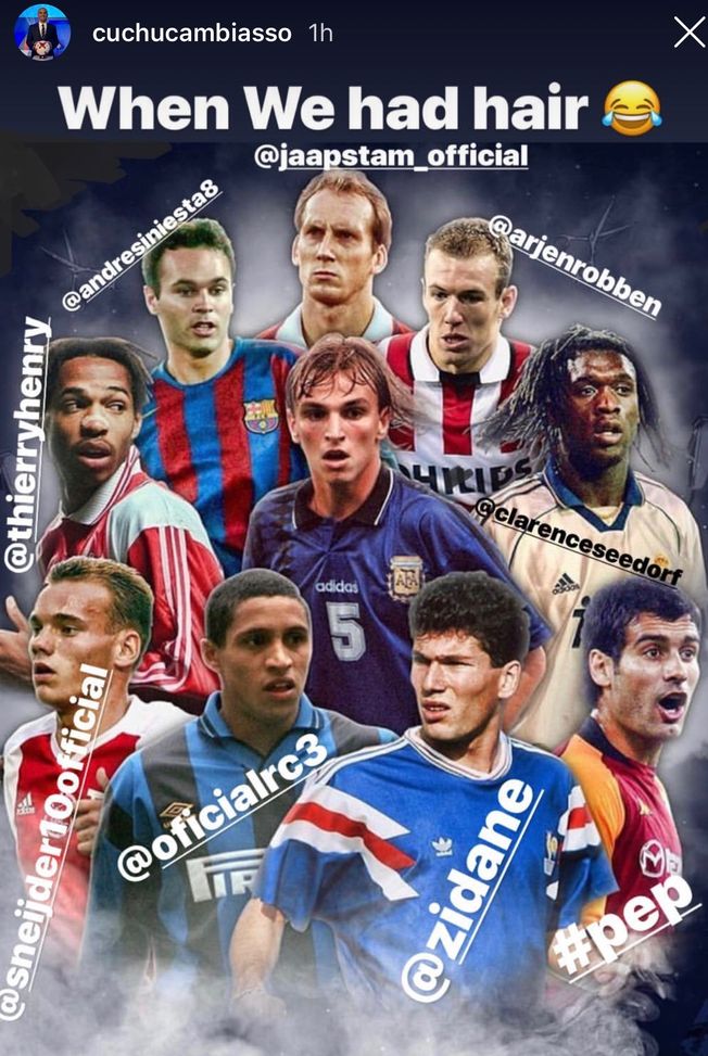 Esteban Cambiasso, ex giocatore dell'Inter, ha condiviso una foto insieme a tantissimi altri campioni appartenenti nel passato alle squadre più diverse. Che cosa hanno in comune Seedorf, Stam, Robben, Iniesta, Henry, Sneijder, Roberto Carlos, Zidane, Pep e appunto Cambiasso? Una volta tutti loro erano dotati di capelli...