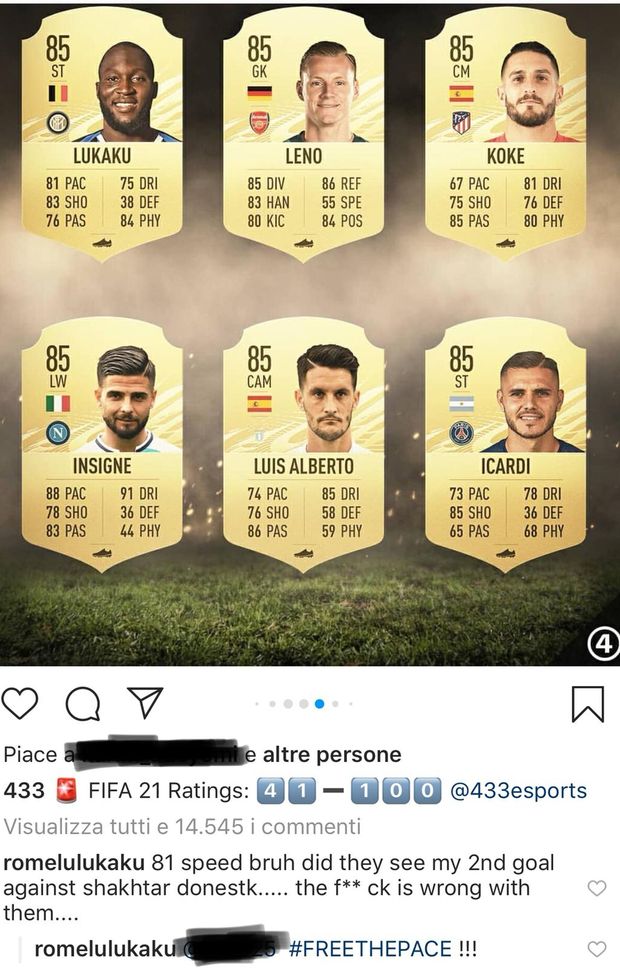 Come ogni anno arriva uno dei momenti più attesi dagli appassionati di videogiochi: le valutazioni che Fifa assegna ai giocatori. Valutazioni che hanno sempre fatto discutere, in primis i giocatori e questa volta è il caso di Romelu Lukaku. Quello che non è andato giù al giocatore è soprattutto la valutazione sulla velocità (81). "Non avete visto il mio secondo gol contro lo Shakhtar. Questo è fo**utamente sbagliato", ha scritto su Instagram il belga. Ma non finisce qui, per su Twitter Lukaku scrive: "Siamo onesti, Fifa si limita a pasticciare con le valutazioni così noi giocatori iniziamo a lamentarci del gioco e dare loro più pubblicità... non sono con questa mer**. So quello che faccio".