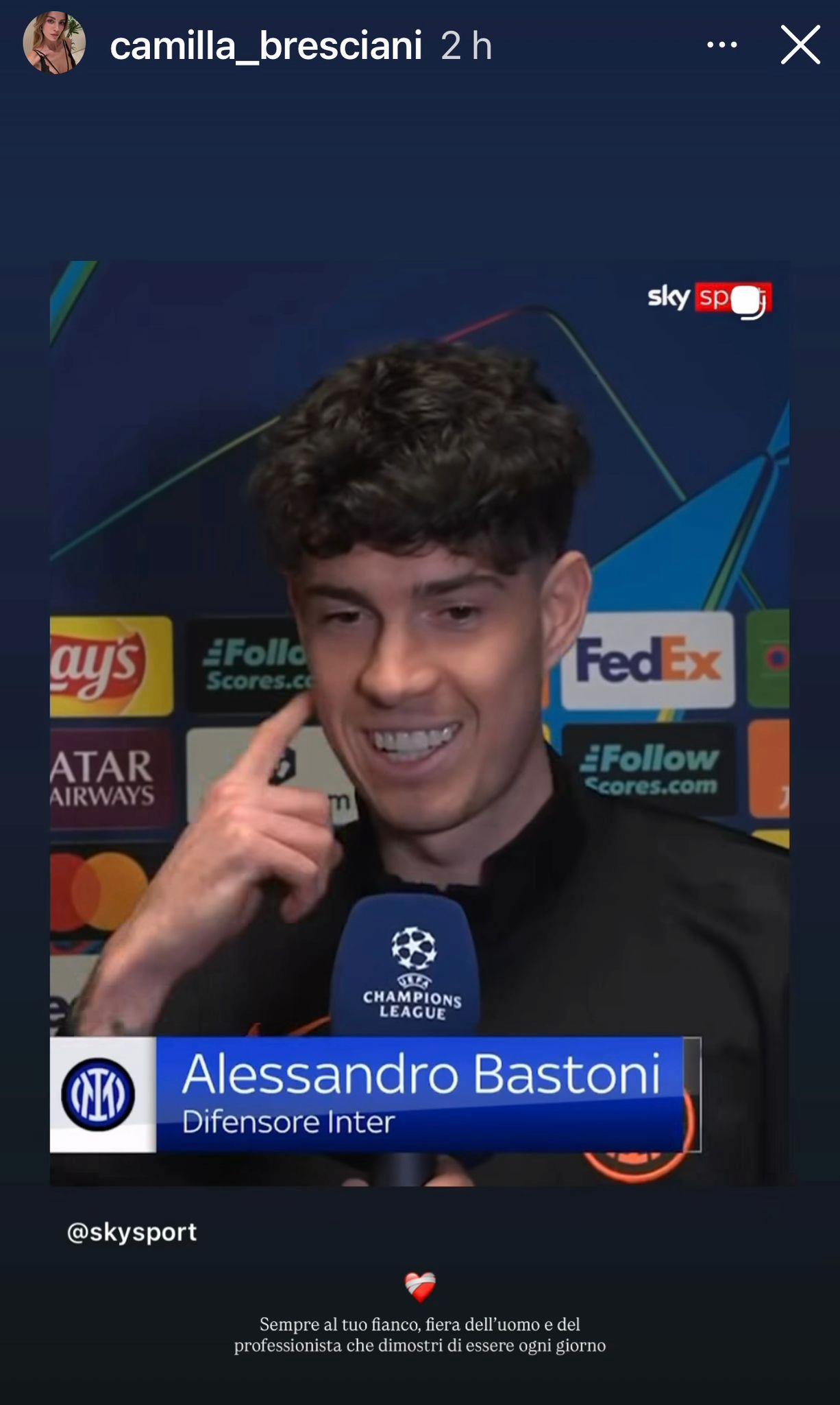 —In questi giorni difficili ci sono state molte minacce all'indirizzo della famiglia di Alessandro Bastoni: "Mi dispiace per mia moglie e per mia figlia, mia moglie si è trovata minacce di morte che non stanno né in cielo né in terra, questo va condannato". Dopo le parole del difensore dell'Inter in conferenza stampa, si è espressa anche la moglie Camilla: "Sempre al tuo fianco. Fiera dell'uomo e del professionista che dimostri di essere ogni giorno".