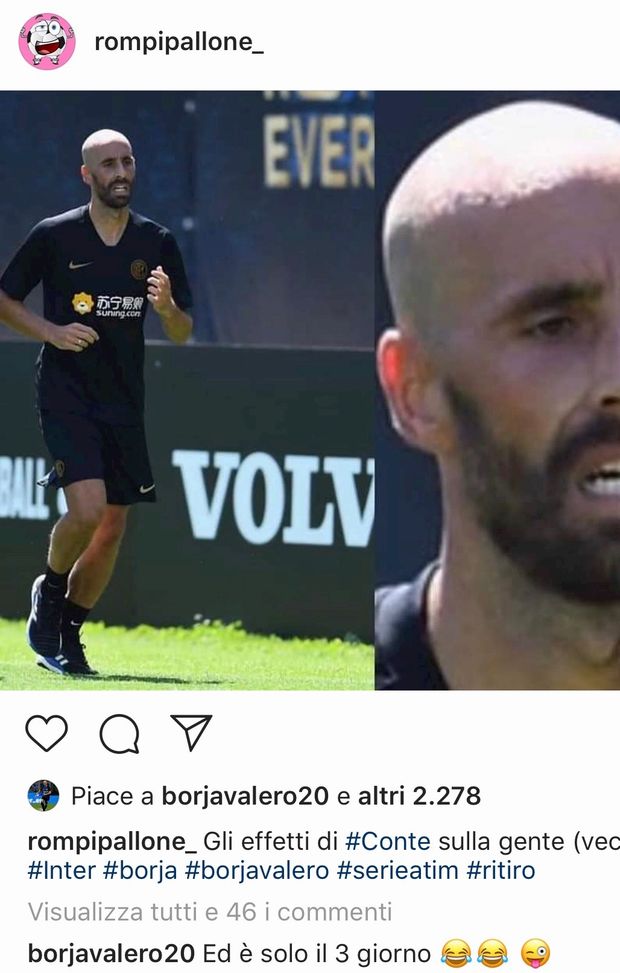 Dal ritiro dell'Inter è emersa una certezza: Conte sta torchiando il gruppo nerazzurro con allenamenti a dir poco intensivi. La settimana di ritiro si concluderà domenica con la partita contro il Lugano, poi la partenza per la tournée. Sui social si è ironizzato sulla fatica alla quale i giocatori nerazzurri sono sottoposti. Il Rompipallone, su Instagram, ha pubblicato la foto di un Borja Valero provato e ha commentato: "Gli effetti di Conte sulla gente vecchia". Immediata la risposta ironica del centrocampista: "Ed è solo il terzo giorno".