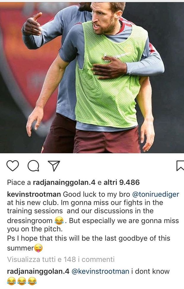 Dopo Salah e Paredes, la Roma ha perso un altro pezzo da 90, Antonio Rüdiger. Il difensore è un nuovo giocatore del Chelsea e il suo ex compagno, Kevin Strootman, ha voluto salutare con un post il giocatore: "Buona fortuna a mio fratello Rüdiger al suo nuovo club. Mi mancheranno le nostre battaglie durante gli allenamenti e le nostre discussioni nello spogliatoio. Ma soprattutto mi mancherai in campo. Spero che questo sia l'ultimo arrivederci per questa estate". Tra i tanti che hanno commentato il post, anche Radja Nainggolan con un "non lo so", una risposta che alimenterà ancora dubbi sul futuro a Roma del Ninja.