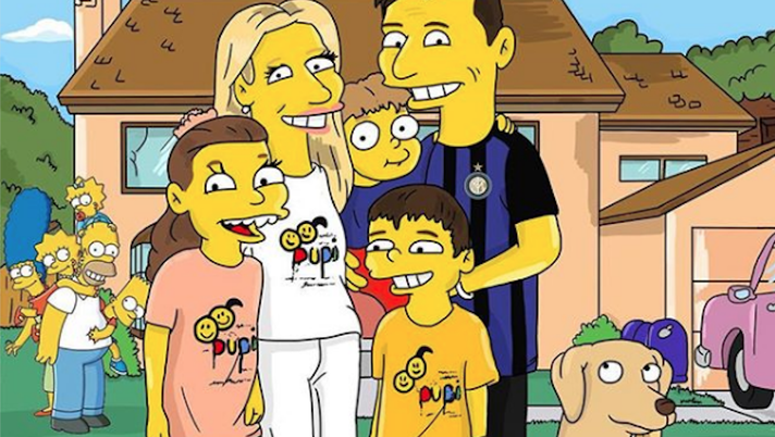 Zanetti e la sua famiglia in versione Simpson. Logo della Fondazione Pupi e maglia dell’Inter