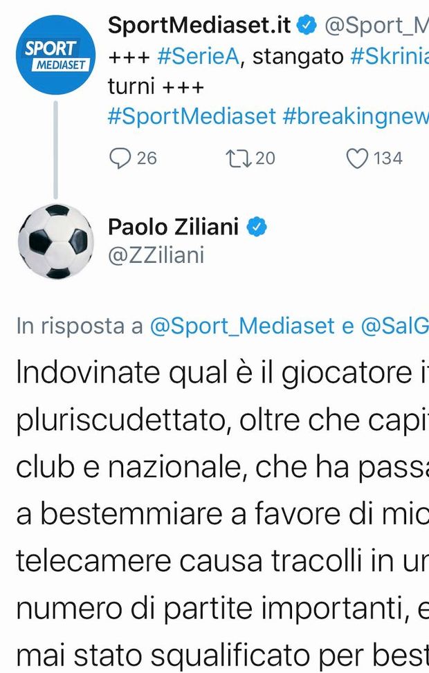 Paolo Ziliani ha commentato la notizia della stangata inferta dal giudice sportivo a Milan Skriniar dopo Inter-Sassuolo. Il giornalista del Fatto Quotidiano ha ricordato il precedente di un giocatore, che l'ha sempre passata liscia: "Indovinate qual è il giocatore italiano pluriscudettato, oltre che capitano in club e nazionale, che ha passato la vita a bestemmiare a favore di microfoni e telecamere causa tracolli in un certo numero di partite importanti, e non è mai stato squalificato per bestemmia...". Con queste affermazioni Ziliani fa un chiaro riferimento a Gigi Buffon, giocatore della Juventus.