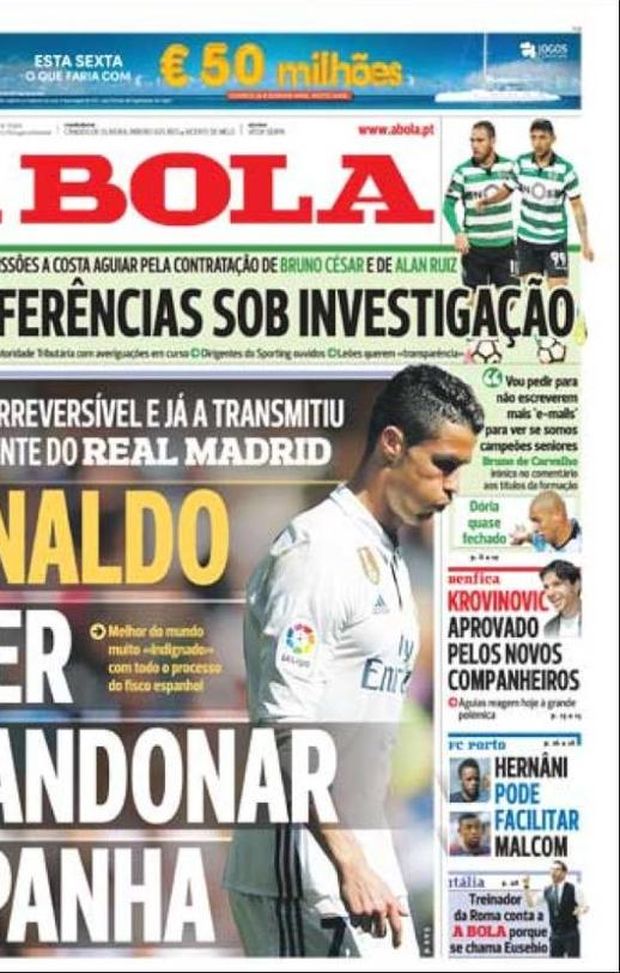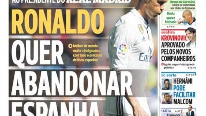 Ha del clamoroso la notizia pubblicata questa mattina in Portogallo: secondo quanto riporta A Bola, Cristiano Ronaldo avrebbe comunicato al Real Madrid la sua intenzione di lasciare la Spagna al termine della Confederations Cup. Inequivocabile la prima pagina del quotidiano portoghese, che titola con un eloquente "Cristiano vuole lasciare la Spagna". Una decisione irrevocabile, nata dopo lo scandalo fiscale che ha travolto il fuoriclasse lusitano: una vicenda che lo ha profondamente amareggiato, facendolo sentire "vittima di persecuzioni".