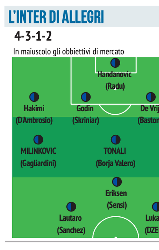 "Conte alla Juve rinunciava ad uno tra Marchisio, Vidal, Pogba e Pirlo mentre Allegri li schierò tutti, sottraendo semmai un centrale difensivo. La storia si ripeterebbe nell’Inter dove lo scarto è Eriksen, uno di quei giocatori di qualità e pensiero che Max considera vitali. Il danese sarebbe libero di trovarsi la posizione dietro alle due punte - Lukaku e Lautaro, con Sanchez e Dzeko, apprezzato da Allegri, come alternative - che conserverebbero l’adorata e proficua convivenza. Salterebbe un centrale difensivo tra i titolari, non in rosa: Godin e De Vrij, Skriniar e Bastoni sarebbero valorizzati dalla linea a quattro, soprattutto lo slovacco al punto da bloccarne la cessione.