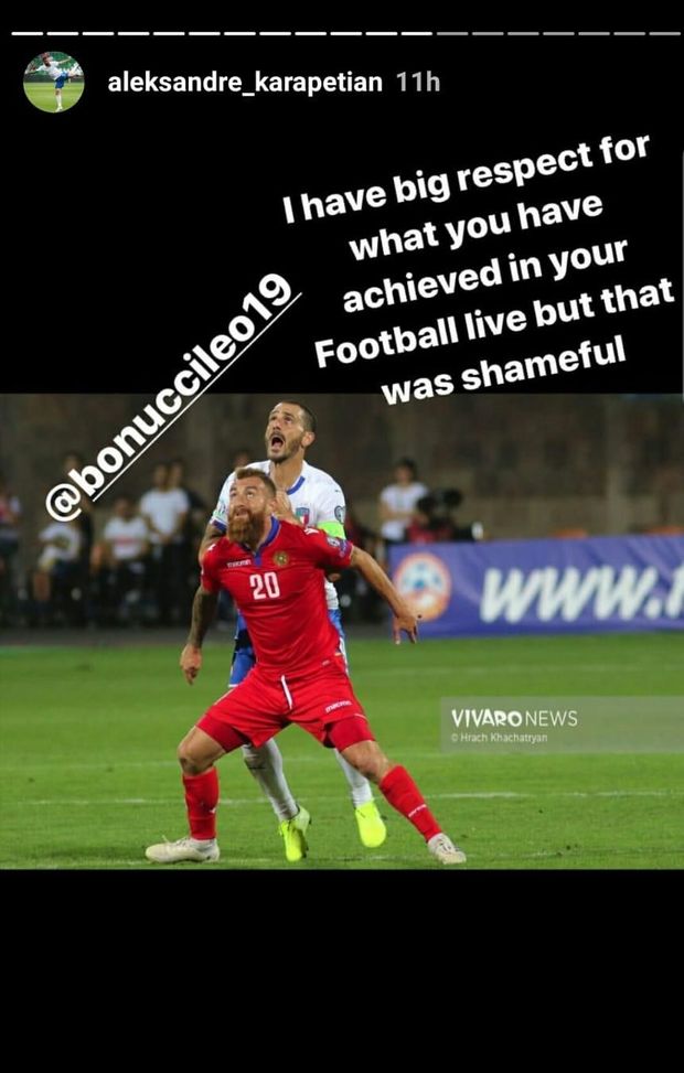 Non è andata giù ad Aleksandre Karapetian l'espulsione rimediata ieri sera in occasione della gara contro l'Italia: l'attaccante armeno ha ricevuto il secondo cartellino giallo per una gomitata rifilata a Leonardo Bonucci, terminando così in anticipato la sua partita. Un episodio che, alla luce dei replay successivi, non meritava ulteriori sanzioni, e che ha evidenziato la palese simulazione del capitano azzurro. Karapetian, attraverso il suo profilo Instagram, ha attaccato senza mezzi termini il difensore della Juventus e della Nazionale: "Ho grande rispetto per quanto fatto nel corso della tua carriera calcistica, ma quello che hai fatto ieri è vergognoso".