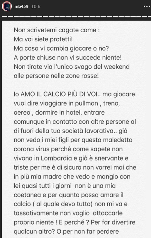 "Non scrivetemi cagate come. 'Ma voi siete protetti! Ma cosa vi cambia giocare o no? A porte chiuse non vi succede niente! Non tirate via l'unico svago del weekend alle persone nelle zone rosse! Io amo il calcio più di voi, ma giocare vuol dire viaggiare in pullman, treno, aereo, dormire in hotel, entrare comunque in contatto con altre persone al di fuori della tua società lavorativa. Già non vedo i miei figli per questo maledetto coronavirus perché come sapete non vivono in Lombardia e già è snervante e triste per me. E in più mia madre che vedo e mangio con lei quasi tutti i giorni e non è una mia coetanea e per quanto possa amare il calcio (al quale devo tutto) non mi va tassativamente, non voglio attaccarle proprio niente! E perché? Per far divertire qualcun altro? O per non far perdere soldi? Ma dai non scherzate! Ripigliatevi, avete rotto adesso. Non si scherza con la salute ragazzi".