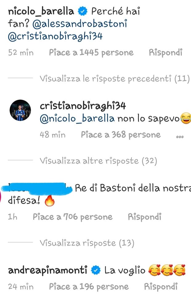 I suoi compagni ci hanno scherzato su. Come Brozovic che ha scritto: "Una per me?". E Barella lo ha preso in giro: "Perché, tu hai dei fans?", ha scritto. Ha taggato pure Biraghi che gli ha retto il gioco: "Ah, non lo sapevo che li avesse". Arriva anche il commento di Pinamonti: "La voglio".