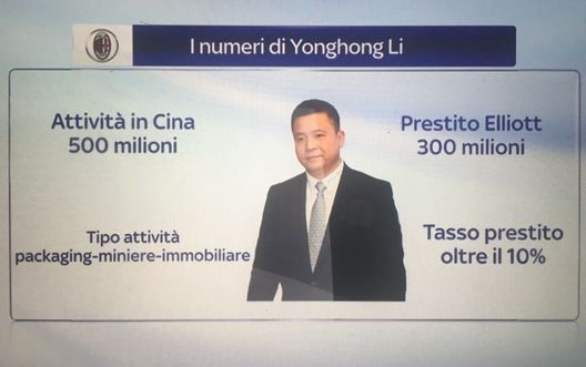 "Yonghong Li non è un uomo ricco a questi livelli: si stima che abbia attività in Cina che valgono 500 milioni e ha ottenuto quasi la metà dei fondi per comprare il Milan da un fondo americano, Elliott, e dovrà restituire questi soldi. C'è un prestito che in 18 mesi bisogna iniziare a pagare, perché in questo momento il Milan è in pegno ad un fondo americano, e, a differenza di Suning, che si è mosso nelle direttive del governo di Pechino, Li ha perso i suoi referenti politici ed ecco perché il governo è stato sempre molto freddo su questa operazione. Nella prima lista degli investitori c'erano molte istituzioni finanziarie controllate dal governo che poi sono sparite. Li vorrebbe portare il Milan in Champions in modo da riaccreditarsi con Pechino, riavere soci importanti che gli prestino soldi e che entrino in società", ha concluso Bellinazzo.