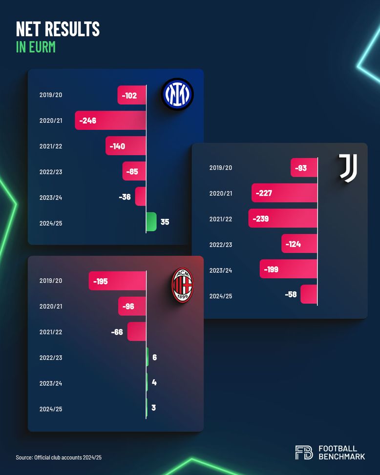 "I due club milanesi festeggiano in attivo. Per l'Inter, l'utile di 35 milioni di euro è un evento una tantum: almeno dai tempi di Ernesto Pellegrini, i nerazzurri avevano conosciuto solo perdite. La scorsa stagione ha segnato un punto di svolta dopo una graduale riduzione del deficit: da -246 milioni di euro nel 2020/21 a -140 milioni di euro nel 2021/22, -85 milioni di euro nel 2022/23 e -36 milioni di euro nel 2023/24.