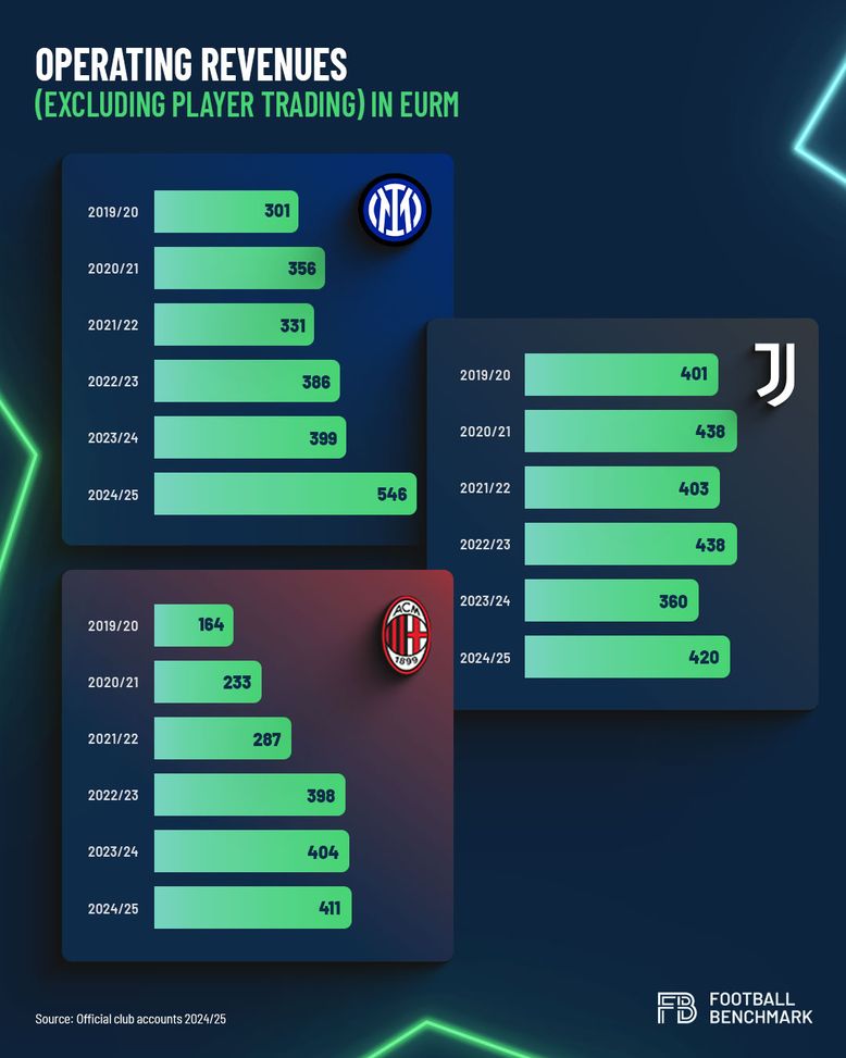 Il quadro macro dei ricavi core – escludendo quindi l'attività di trasferimento – è il seguente: Inter 546 milioni di euro, Juventus 420 milioni di euro, Milan 411 milioni di euro. Da notare che la Juventus, con uno stadio da 41.000 posti, genera 72 milioni di euro di ricavi da partite, a cui si aggiungono 8 milioni di euro di hospitality e 10 milioni di euro di diritti di denominazione, che figurano tra i ricavi commerciali. L'Inter, raggiungendo le fasi finali della Champions League, ha guadagnato 103 milioni di euro dal suo stadio da 75.000 posti, mentre il Milan ha raggiunto i 68 milioni di euro.