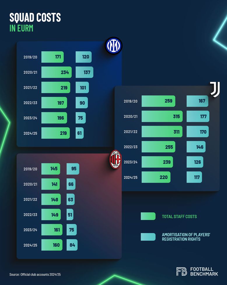 Juventus e Inter, nonostante gli sforzi di contenimento dei costi, continuano a presentare carichi salariali più elevati: rispettivamente 220 milioni di euro e 219 milioni di euro. Il Milan, sotto la guida di RedBird, è tornato a spendere cifre significative per i trasferimenti, mantenendo livelli salariali sostenibili. Pertanto, gli ammortamenti sono balzati da 51 milioni di euro nel 2022/23 a 84 milioni di euro nell'ultimo esercizio, superando l'Inter (61 milioni di euro) ma rimanendo ben al di sotto della Juventus, che qualche anno fa aveva raggiunto i 170 milioni di euro prima di scendere a 117 milioni di euro.