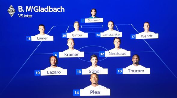 Al Borussia Park, la squadra tedesca - secondo miglior attacco della Champions League con 14 gol all'attivo - punta su Valentino Lazaro, esterno austriaco di proprietà proprio dell'Inter. Secondo Sky Sport, il classe 1996 giocherà nel tridente con Stindl e Thuram alle spalle del francese Plea. Il Borussia Monchengladbach è ancora imbattuto in casa in questa stagione tra Bundesliga e Champions League: l'Inter spera di interrompere questa striscia e continuare a sperare nella qualificazione.