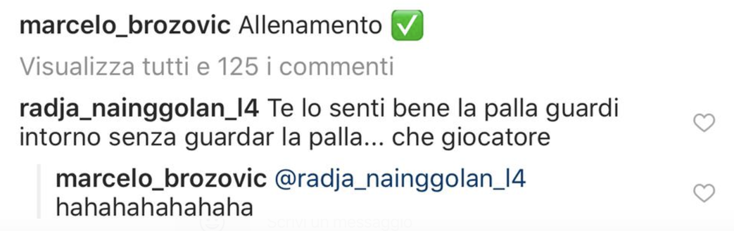 Sono ufficialmente ripresi gli allenamenti di gruppo al Suning Training Centre di Appiano Gentile e ovviamente anche Marcelo Brozovic è tornato a disposizione di Antonio Conte. Il centrocampista ha poi postato uno scatto riguardante la sessione di oggi, commentato poi dall'ex compagno Radja Nainggolan, che ha scritto: "Te senti bene la palla, guardi intorno senza guardarla: che giocatore". Il croato ha risposto con una risata per chiudere questo siparietto social.