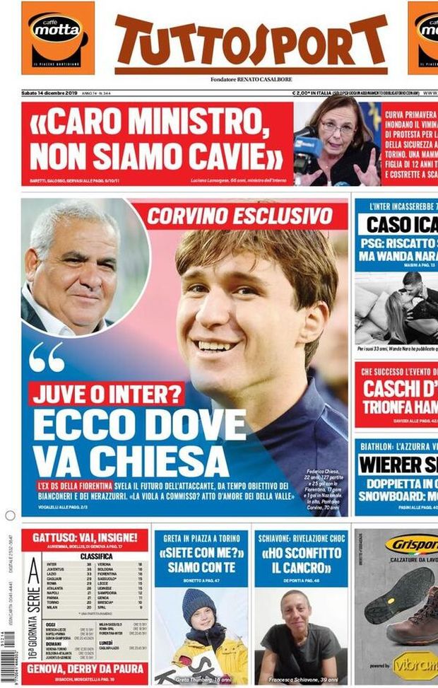 "Juve o Inter? Ecco dove va Chiesa". E' questo il titolo di Tuttosport in edicola sabato 14 dicembre 2019 in merito all'intervista concessa dall'ex DS della Fiorentina Pantaleo Corvino al quotidiano torinese. Di spalla, invece, spazio al futuro di Icardi: "caso Icardi. PSG: riscatto subito ma Wanda frena. L'Inter incasserebbe 70 milioni", il commento di Tuttosport.