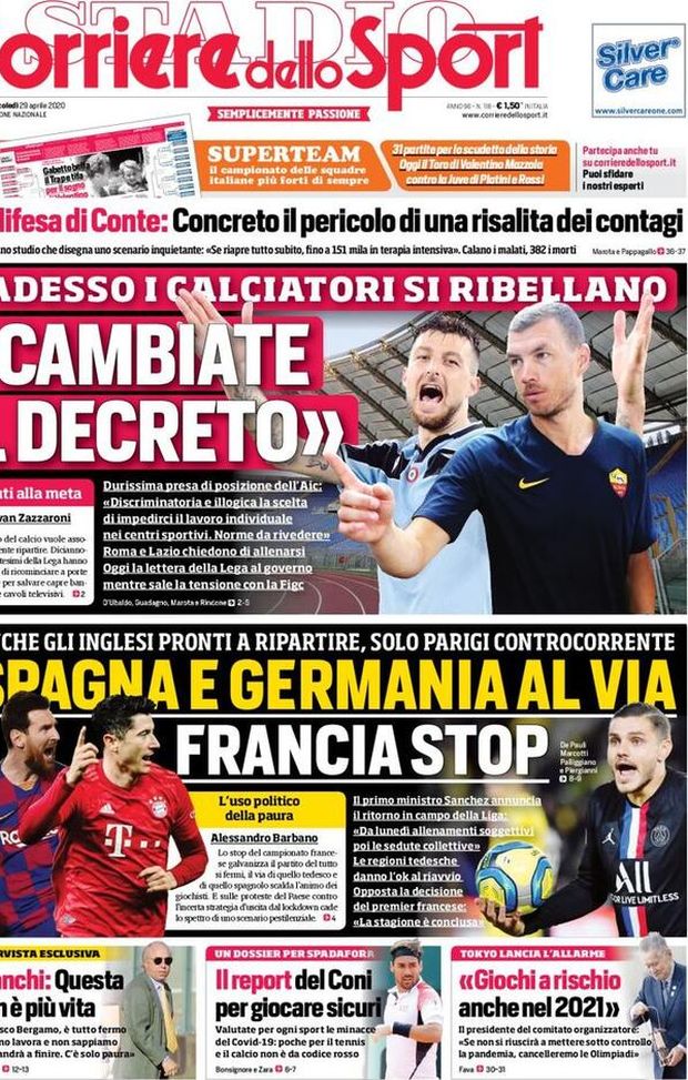 Il Corriere dello Sport parla delle polemiche attorno alla ripartenza del calcio sulla prima pagina di oggi. Il titolo principale dell'edizione di oggi è questo: "Adesso i calciatori si ribellano. «Cambiate il decreto». Durissima presa di posizione dell'AIC: «Discriminatoria e illogica la scelta di impedirci il lavoro individuale nei centri sportivi. Norme da rivedere». Roma e Lazio chiedono di allenarsi. Oggi la lettera della Lega al governo mentre sale la tensione con la FIGC". E poi ancora: "Spagna e Germania al via, Francia stop. Anche gli inglesi pronti a ripartire. Solo Parigi controcorrente".