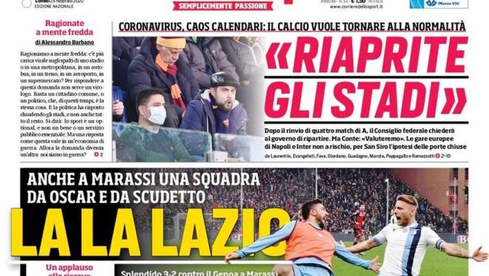 Il quotidiano esalta la Lazio, sempre più in lotta per il titolo dopo il successo con il Genoa: "La La Lazio. Anche a Marassi una squadra da Oscar e da scudetto".