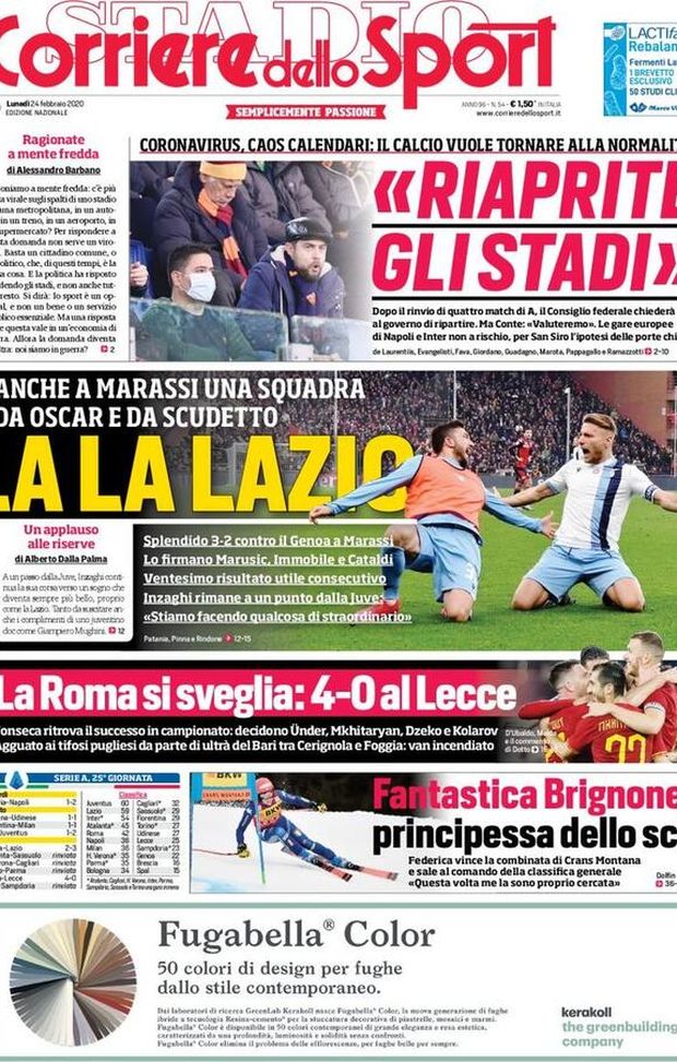 "Coronavirus, caos calendari: il calcio vuole tornare alla normalità". Il Corriere dello Sport affronterà il tema nella prima pagina di lunedì 24. "Riaprite gli stadi - si legge - "Dopo il rinivio di quattro match di A, il Consiglio federale chiederà al governo di ripartire. Ma Conte: "Valuteremo". Le gare europee di Napoli e Inter non a rischio, per San Siro l'ipotesi delle porte chiuse".