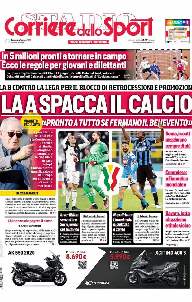 Il 13 giugno, fra pochi giorni, l'Inter torna in campo. A riaprire la stagione dei nerazzurri sarà la semifinale di ritorno di Coppa Italia, al San Paolo contro il Napoli di Gattuso, che partono in vantaggio dopo l'1-0 inflitto ai ragazzi di Conte a San Siro. Sulla sfida, il Corriere dello Sport titola sulla prima pagina in edicola nelle prossime ore: "Napoli-Inter, l'accelerata di Gattuso e Conte. La mano dei tecnici si avvertirà di più dopo lo 0-1 di San Siro. Decisivi gli attacchi".