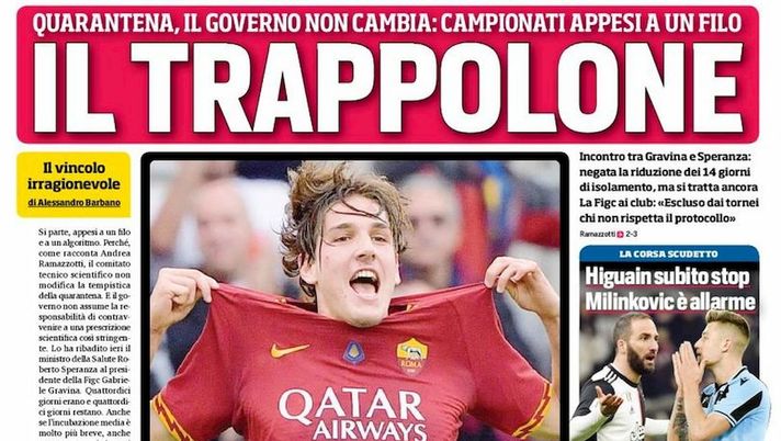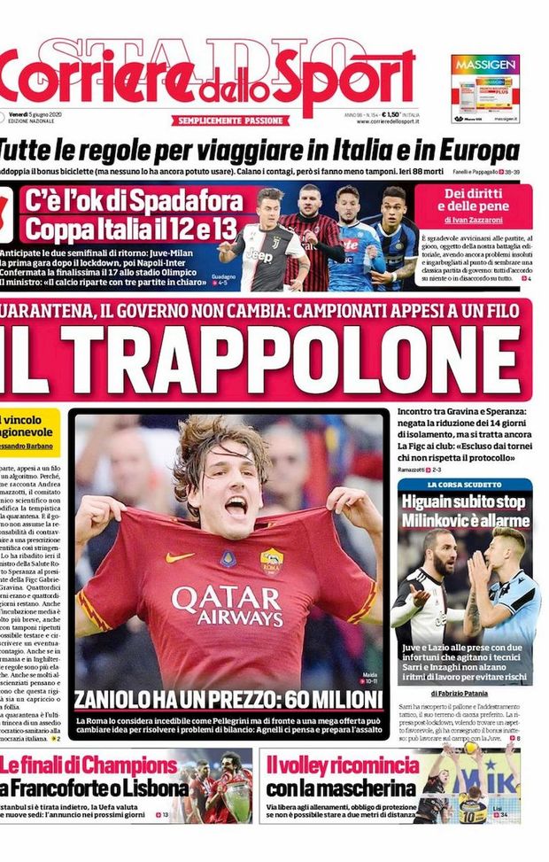 "C'è l'ok di Spadafora. Coppa Italia il 12 e il 13. Anticipate le due semifinali di ritorno: Juve-Milan la prima gara dopo il lockdown, poi Napoli-Inter. Confermata la finalissima il 17 allo stadio Olimpico. Il ministro: 'Il calcio riparte con tre partite in chiaro'". Così, sulla prima pagina in edicola nelle prossime ore, il Corriere dello Sport titola sul via libera di Spadafora all'anticipo delle semifinali di Coppa Italia.