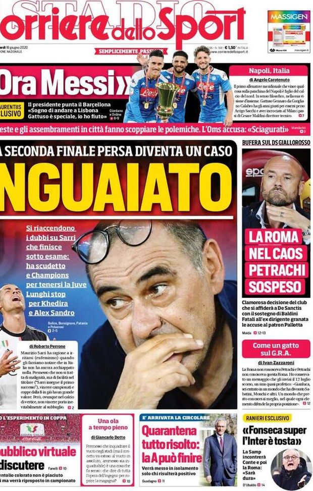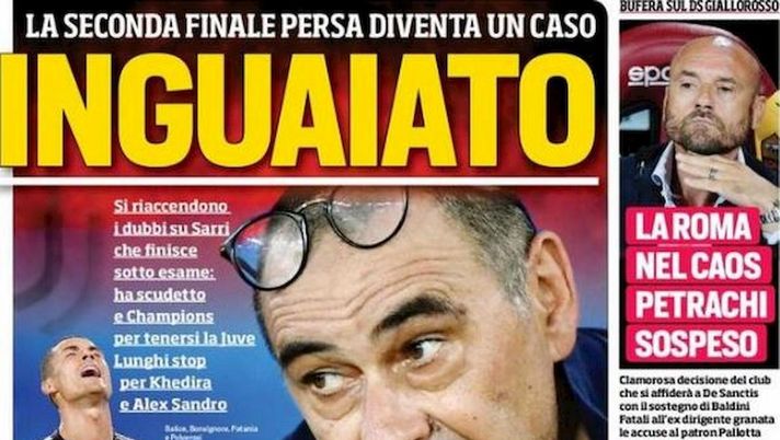 "Inguaiato". È il titolo principale del Corriere dello Sport che si riferisce a Maurizio Sarri e alla seconda sconfitta in una finale, Supercoppa e Coppa Italia. In esclusiva c'è anche un'intervista a Claudio Ranieri. Conte affronterà l'ex allenatore nerazzurro nella prima gara di campionato, contro la Samp. E proprio il tecnico blucerchiato dice: "Incontreremo Roma e Inter? Sarà dura. Fonseca è super e l'Inter è tosta".