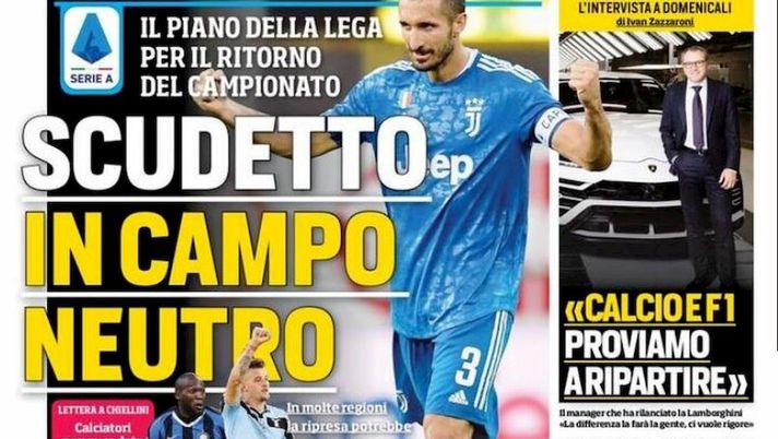 Il Corriere dello Sport parla della ripresa del campionato e del piano della Lega Calcio per ricominciare: "Scudetto in campo neutro", è il titolo principale del quotidiano sportivo romano. Ed aggiunge: "In molte regioni la ripresa potrebbe essere più lenta. Possibile il cambio sede di alcune partite. Caso stipendi: interisti pronti al dialogo ma Lega e AIC litigano sul mese di marzo".