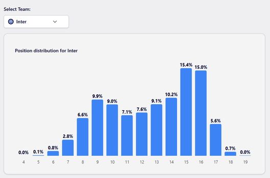 La sconfitta contro l'Arsenal ha fatto scivolare l'Inter fuori dalle prime 8, in attesa delle gare di questa sera. Secondo Football meet Data, la posizione più probabile dove dovrebbe qualificarsi l'Inter è al quindicesimo o sedicesimo posto. Ecco le statistiche sulle % in merito di posizione in classifica: