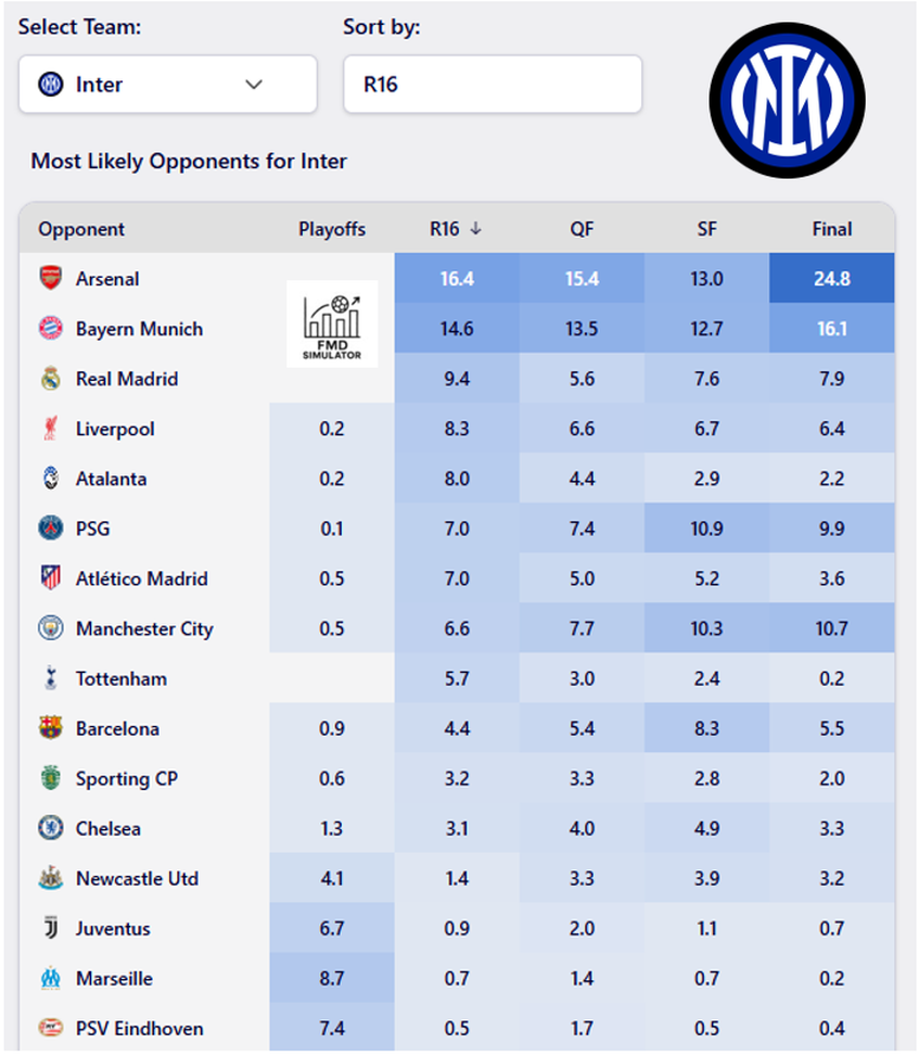 Quasi certa di andare al doppio scontro, andata e ritorno dei playoff, l'Inter secondo le previsione ha come avversario più probabile il Marsiglia, 8,7% di possibilità di incontrare i francesi, seguito dal Psv. Agli ottavi, una volta superati, i playoff l'inter potrebbe ritrovare di nuovo l'Arsenal: 16,4% di possibilità di incontrare i Gunners.