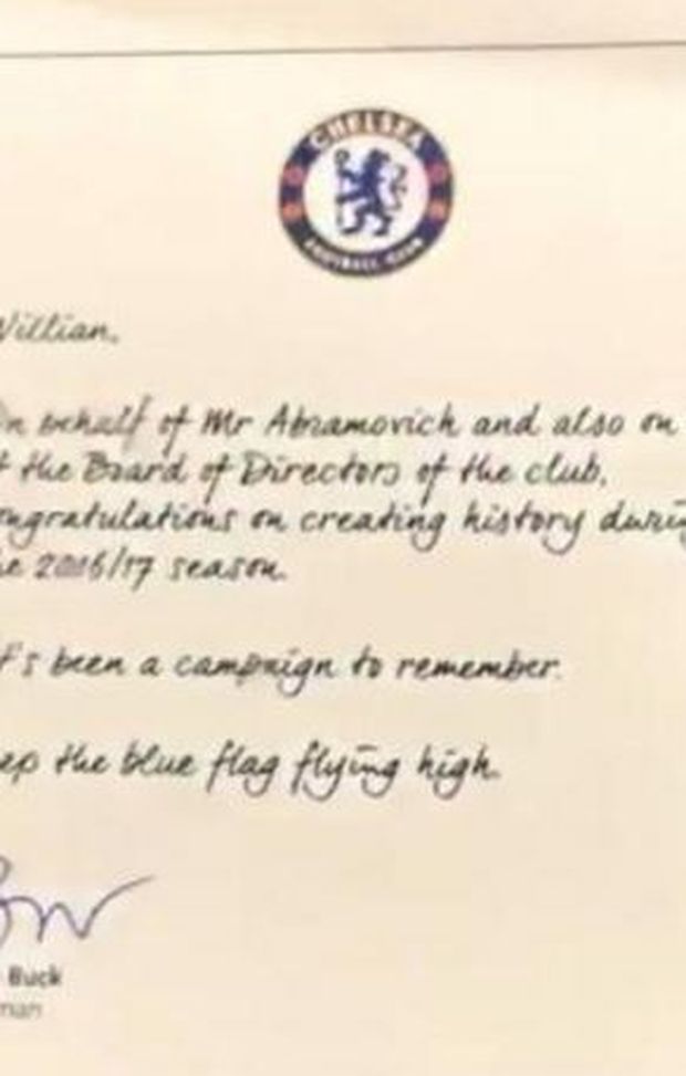 Ai giocatori è arrivata una scatola con un messaggio del presidente Buck. L'orologio della Hublot, sponsor del club inglese, è un'edizione limitata, ce ne sono solo 200 pezzi sul mercato e ogni orologio costa 9000 sterline, circa 10miladuecento euro. "A nome del sig. Abramovich e anche per conto del consiglio di amministrazione del club, congratulazioni per la vittoria della stagione 2016/17. È stata una stagione da ricordare. Mantieni la bandiera del Chelsea alta nel cielo".