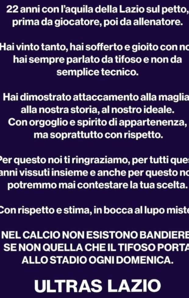 "22 anni con l'aquila della Lazio sul petto, prima da giocatore, poi da allenatore. Hai vinto tanto, hai sofferto e gioito con noi, hai sempre parlato da tifoso e non da semplice tecnico. Hai dimostrato attaccamento alla maglia, alla nostra storia, al nostro ideale. Con orgoglio e spirito di appartenenza, ma soprattutto con rispetto. Per questo noi ti ringraziamo, per tutti questi anni vissuti insieme e anche per questo potremmo mai contestare la tua scelta. Con rispetto e stima, in bocca al lupo mister. Nel calcio non esistono bandiere, se non quella che il tifoso porta allo stadio ogni domenica".