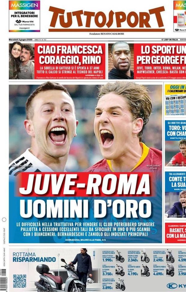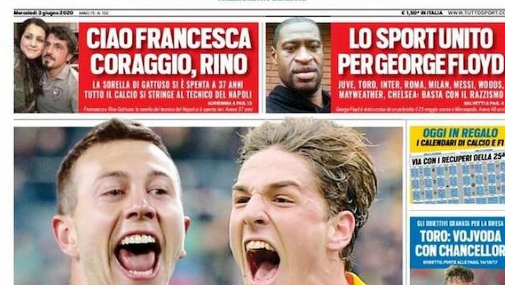 TuttoSport in prima pagina parla di un possibile scambio tra Bernardeschi e Zaniolo. Ma parla anche di Inter in una finestrella e questo è il titolo dedicato ai nerazzurri: "Conte torchia la sua squadra, tra allenamenti duri e mugugni". Spazio anche alla tragedia che ha colpito l'allenatore del Napoli, Gattuso, che ha perso sua sorella Francesca.