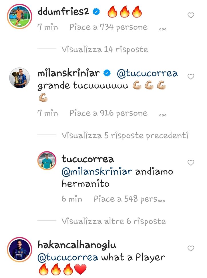 Il gol del due a uno ha fatto impazzire Inzaghi. È corso ad abbracciare Correae i suoi compagni che hanno ribaltato il risultato e una gara che si era fatta difficile dopo il vantaggio del Verona. Poi ha addirittura raddoppiato. Due gol per l'argentino, arrivato qualche giorno fa all'Inter, e tanti sorrisi felici. Applausi dai suoi compagni anche sui social. Lui ha scritto di essere felicissimo per le reti segnate all'esordio.