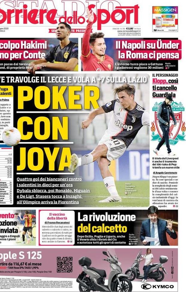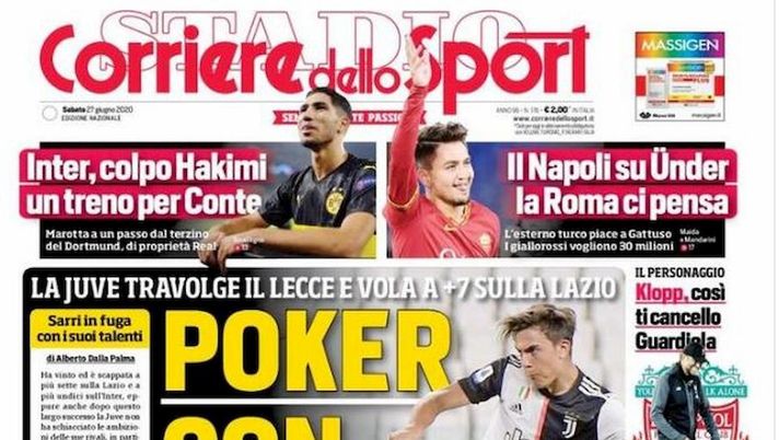 Anche il Corriere dello Sport in prima pagina parla della notizia che ha cambiato la prospettiva degli interisti in queste ore, dopo un pari col Sassuolo difficile da digerire. "Inter, colpo Hakimi: un treno per Conte. Marotta è ad un passo", è il titolo scelto per raccontare un'operazione in dirittura d'arrivo.