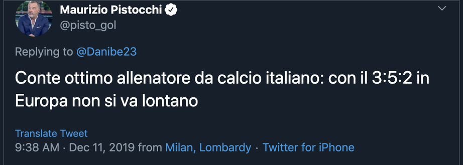 I tifosi si interrogano sul modulo tattico adottato da Antonio Conte, quel 3-5-2 che per molti è la causa principale dell'eliminazione dalla Champions - "Conte ottimo allenatore da calcio italiano: con il 3-5-2 in Europa non si va lontano" la risposta di Maurizio Pistocchi.