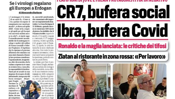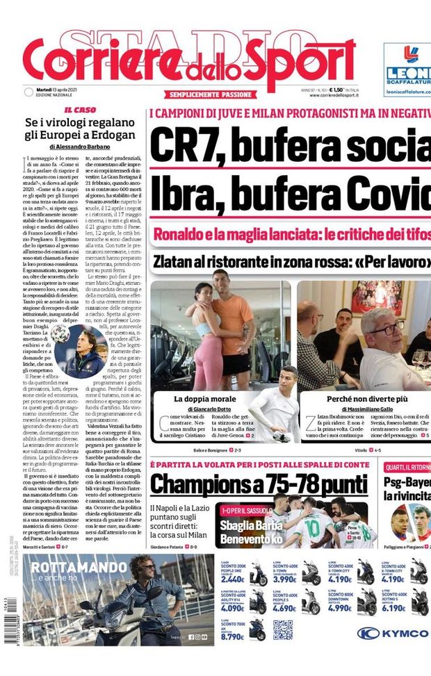 "CR7, bufera social. Ibra, bufera Covid. Ronaldo e la maglia lanciata: le critiche dei tifosi. Zlatan al ristorante in zona rossa. 'Per lavoro'. Recita così il titolo della copertina della prima pagina del Corriere dello Sport in edicola martedì 13 aprile 2021. "I campioni di Juve e Milan protagonisti ma in negativo". In taglio basso, invece, si parla della corsa Champions "Champions a 75-78 punti, è partita la volata per i posti alle spalle di Conte" e di PSG-Bayern Monaco.