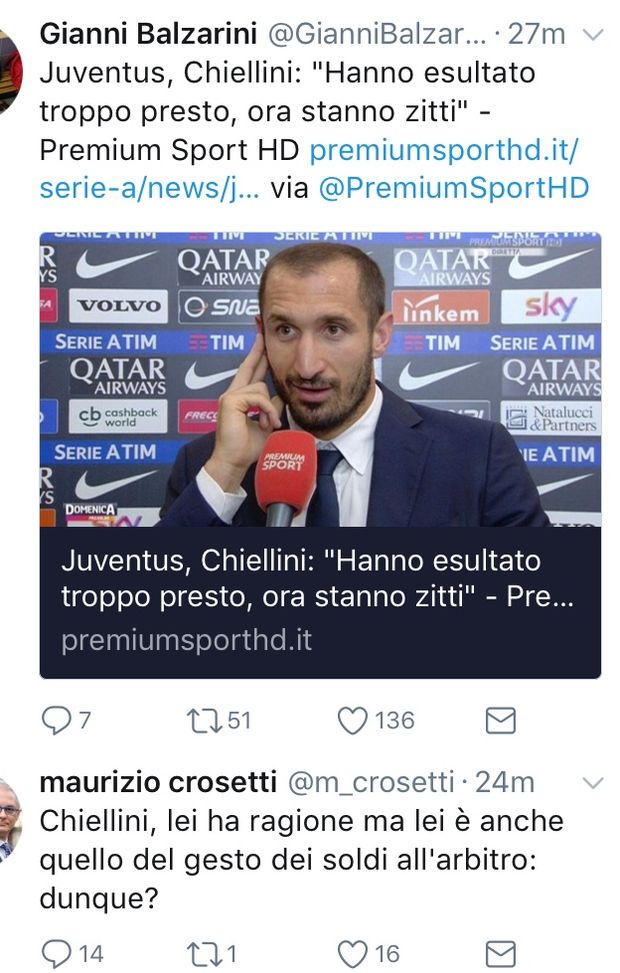 Giorgio Chiellini non si è trattenuto, in occasione del settimo scudetto vinto, dal rilasciare dichiarazioni pungenti e polemiche: "Guardateci vincere, avete esultato troppo presto" (leggi qui le dichiarazioni complete). Maurizio Crosetti, giornalista di Repubblica, non dimentica però i toni e l'atteggiamento dello stesso Chiellini a Bernabeu, in occasione dell'eliminazione dalla Champions League: "Lei è anche quello del gesto dei soldi all'arbitro, e dunque?"