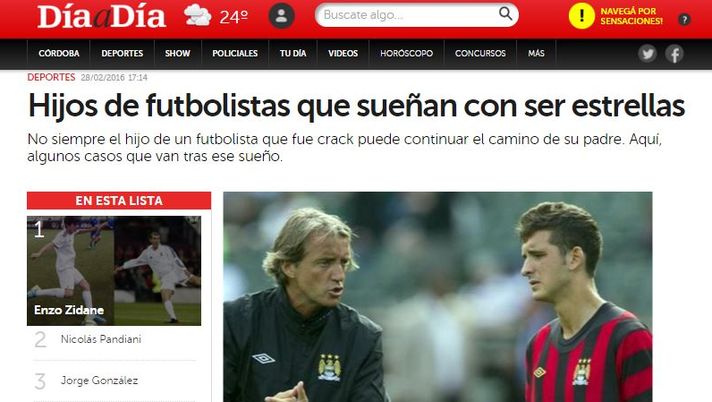 In Argentina, il sito Dia A Dia, ha parlato dei figli dei giocatori che stanno tentando di seguire le orme dei loro padri e tra i dieci ragazzi presi in considerazione c'è anche Andrea, figlio di Roberto Mancini, l'allenatore dell'Inter. Nell'articolo si racconta di Enzo Zidane che ha giocato nelle giovanili del Real Madrid ed è stato convocato dall'Under19 francese. Il figlio di Walter Pandiani, attaccante del Losanna, ha giocato anche con lui nel Miramar, squadra uruguaiana. Il figlio di Rivaldo, Rivaldinho ha 18 anni e gioca con il papà nel XV de Piracicaba. Brooklyn Beckham, figlio di David e Victoria, gioca nelle giovanili del Fulham e ha giocato in passato anche tra i giovani dello United e del Chelsea. Il figlio dell'ex nerazzurro Paul Ince, Tom, oggi gioca nel Derby County. Ed è stato anche ad un passo dall'Inter. Gio Simeone gioca nel Banfield dove è arrivato in prestito dal River Plate, ha giocato anche nell'Under20 della Nazionale Argentina. Christian Maldini gioca nella Primavera del Milan. Andrea, il figlio di Mancini, ha cominciato la sua carriera in nerazzurro proprio quando il suo papà ha allenato la prima volta l'Inter. Lo ha seguito anche al City. Poi ha avuto un'esperienza nel Valladolid e ora gioca in Ungheria nella Szombathelyi Haladas.