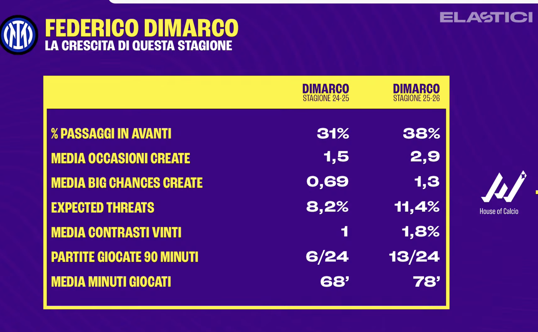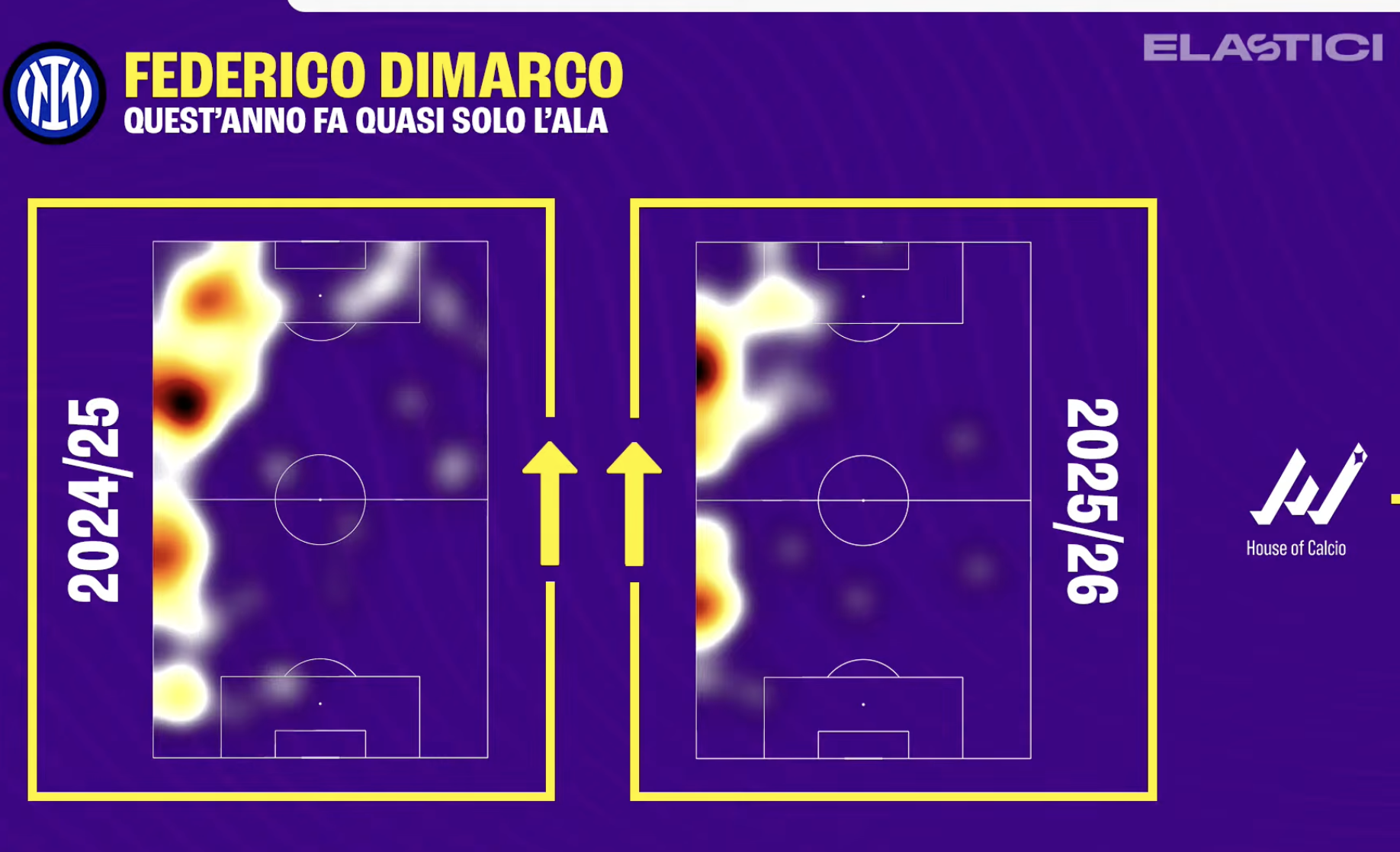 "Dati quasi raddoppiati per occasioni create. Cambiato anche l'expected threats e i passaggi avanti. Giocatore che gioca avanti, ma non solo con la palla, ma gioca più alto. La grande differenza è che il suo spazio è più circoscritto, è diventato davvero più un'ala per questi motivi: mento coinvolto nella fase di sviluppo, di costruzione perché a sinistra si allarga Bastoni che fa quasi il terzino dall'altra parte scende Luis Henrique che ha meno gamba ma è più bravo nello stretto.
