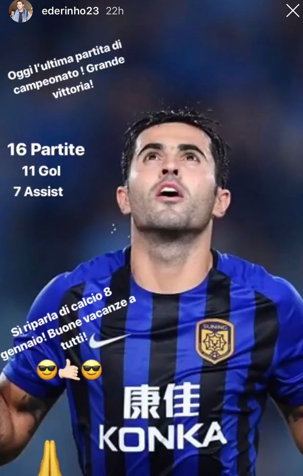 L'ex nerazzurro Eder si è ambientato molto velocemente nel campionato cinese. Il primo bilancio, che lo stesso attaccante ha sintetizzato sui suoi social, è assolutamente positivo. Il campionato si ferma, per Eder arrivano le meritate vacanze: "Oggi l'ultima partita di campionato! Grande vittoria! 16 partite, 11 gol, 7 assist. Si riparla di calcio l'8 gennaio. Buone vacanze a tutti!"