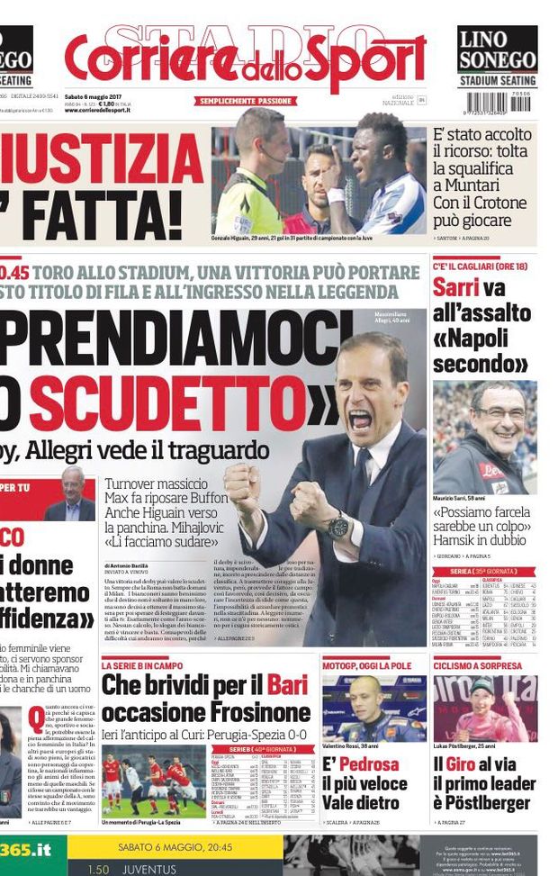 Il Corriere dello Sport in edicola sabato 6 maggio 2017 concede ampio spazio alla Juventus, protagonista nel derby contro il Torino di questa sera: "Toro allo Stadium, una vittoria può portare al sesto titolo di fila e all'ingresso nella leggenda". Spazio anche al caso Muntari "Giustizia è fatta! Accolto il ricorso: tolta la squalifica. A Crotone può giocare" e a Sarri che carica l'ambiente partenopeo: "Napoli secondo, possiamo farcela. Sarebbe un gran colpo".