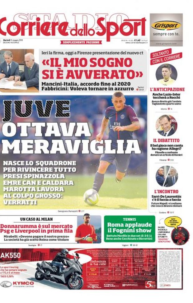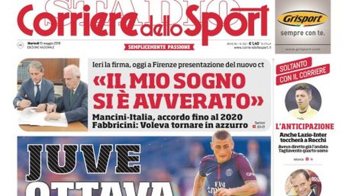 Sulla prima pagina del Corriere dello Sport si parla dell'arbitro per la grande sfida di domenica sera tra Lazio e Inter: "Anche Lazio-Inter toccherà a Rocchi. Aveva diretto già l'andata, Tagliavento quarto uomo".