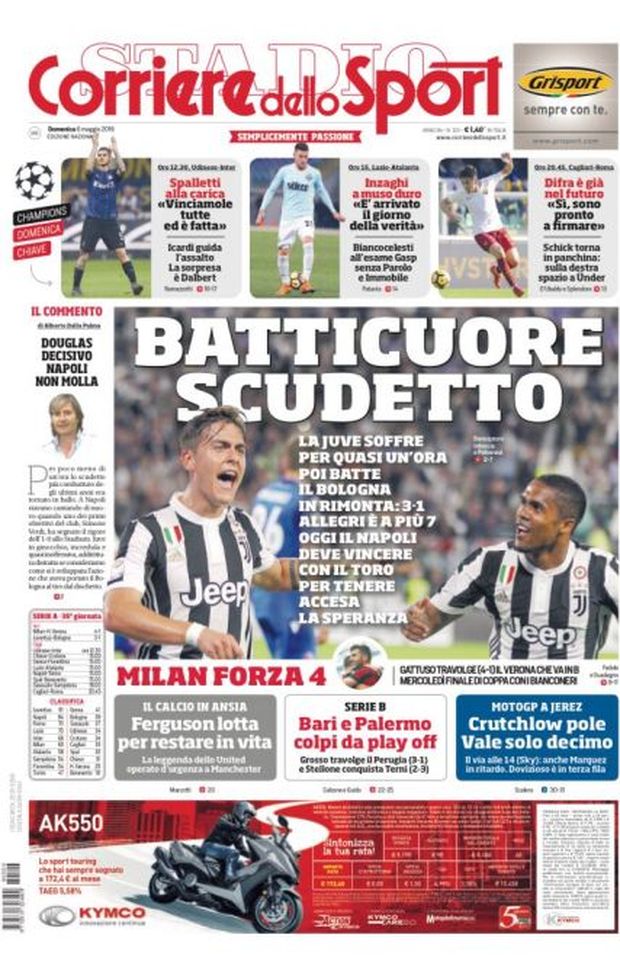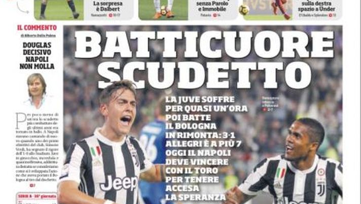 Sulla prima pagina del Corriere dello Sport si parla di "batticuore scudetto" rispetto alla sofferenza della Juventus contro il Bologna per lo svantaggio iniziale. C'è anche un titolo dedicato all'Inter e alle parole di Spalletti pronunciate alla vigilia della gara di Udine in conferenza stampa: "Vinciamole tutte ed è fatta". Il CdS aggiunge anche: "Icardi guida l'assalto, la sorpresa è Dalbert".