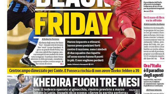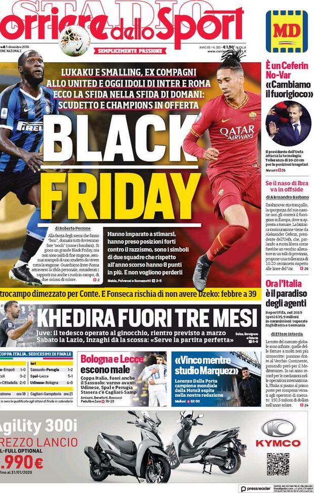 "Black Friday". Il Corriere dello Sport apre l'edizione di giovedì 5 dicembre 2019 con la sfida tra i due ex compagni di squadra al Manchester United Lukaku e Smalling. Venerdì sera i due si affronteranno nella gara da Inter e Roma a San Siro: "Ecco la sfida nella sfida di domani: scudetto e Champions in offerta".