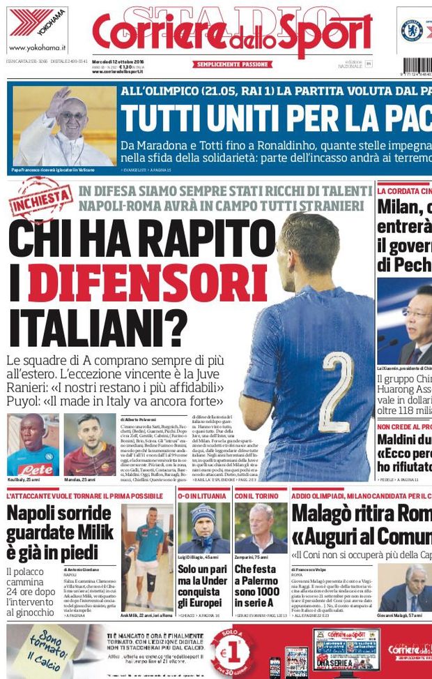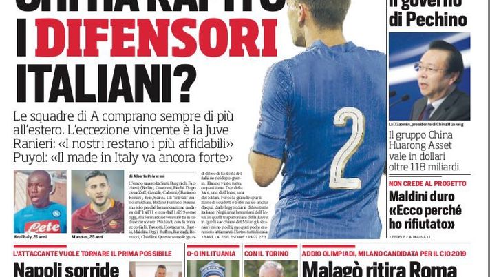 Il Corriere dello Sport in edicola oggi mette in primo piano i difensori: "Chi ha rapito quelli italiani?", si chiede il giornale sportivo. Che aggiunge: "Le squadre di A comprano sempre di più all'estero e l'eccezione vincente è la Juve. In difesa siamo sempre stati ricchi di talenti. Napoli-Roma avrà in campo tutti stranieri". Spazio nel taglio alto alla partita per la Pace di Papa Francesco che si gioca stasera all'Olimpico. Nessun riferimento all'Inter, ma si parla di Milan: "La cordata cinese. Così entrerà in società il governo di Pechino". Maldini duro: "Ecco perché ho rifiutato". Non crede al progetto.