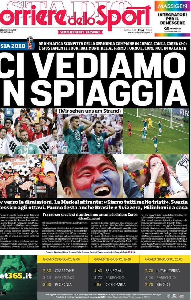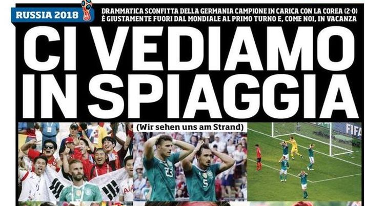 Prima pagina del Corriere dello Sport dedicata alla clamorosa eliminazione al primo turno della Germania dopo la sconfitta arrivata contro la Corea del Sud. "Ci vediamo in spiaggia. Drammatica sconfitta della Germania campione in carica con la Corea (2-0). È giustamente fuori dal Mondiale al primo turno e, come noi, in vacanza".