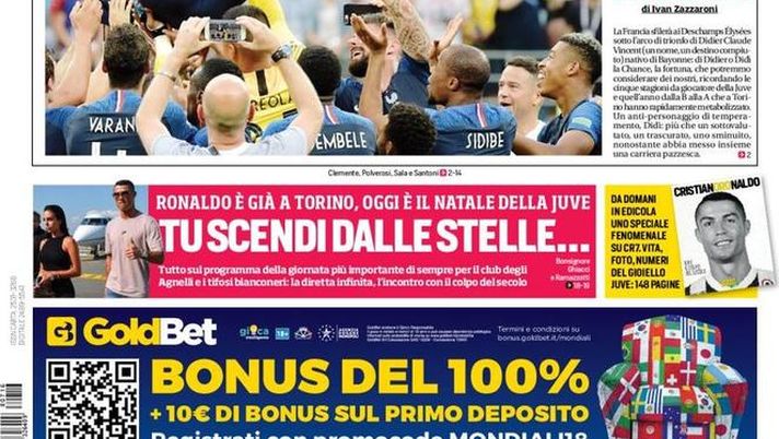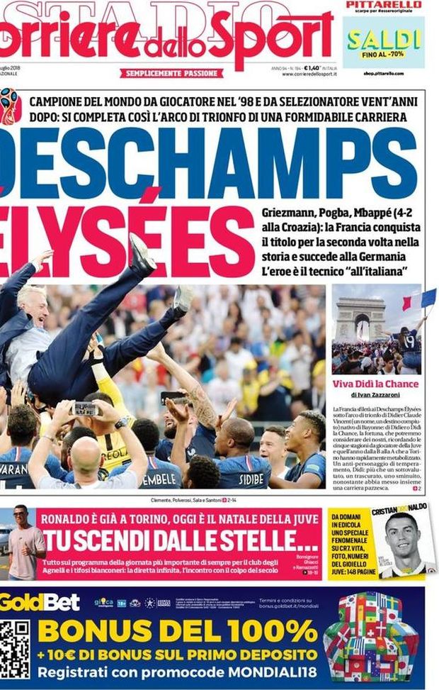 Sulla prima pagina del Corriere dello Sport in edicola nelle prossime ore si parla, ovviamente, della vittoria del Mondiale da parte della Francia di Deschamps in finale contro la Croazia. Titola così il quotidiano: "Deschamps Elysées. Griezmann, Pogba, Mbappé (4-2 alla Croazia): la Francia conquista il titolo per la seconda volta nella storia e succede alla Germania. L'eroe è il tecnico all''italiana'. Campione del mondo da giocatore nel '98 e da selezionatore vent'anni dopo: si completa così l'arco di trionfo di una formidabile carriera".