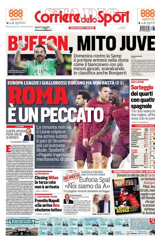La prima pagina del Corriere dello Sport in edicola venerdì 17 marzo regala ampio spazio al tonfo della Roma: "I giallorossi vincono ma non basta (2-1)" con Spalletti che rincara la dose: "Pagate ingenuità, meritavamo di più". In taglio alto, invece, spazio a Buffon e alla Juventus: "Domenica contro la Samp il portiere entrerà nella storia bianconera con più minuti giocati". In taglio basso, invece, perplessità sul closing Milan: "Altro rinvio, la terza rata non è arrivata".