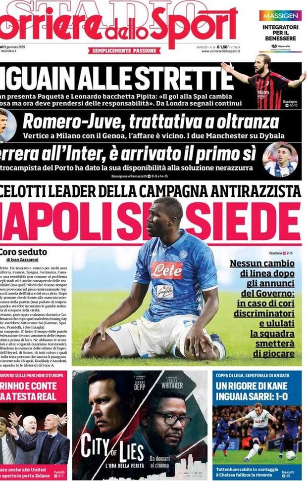 Il Corriere dello Sport in edicola oggi in prima pagina parla anche del mercato dell'Inter e scrive: "Herrera all'Inter, è arrivato il primo sì. Il centrocampista del Porto ha dato la sua disponibilità alla soluzione nerazzurra". Il titolo principale è dedicato al Napoli: "Il Napoli si siede. Ancelotti leader della campagna antirazzista. Nessun cambio di linea dopo gli annunci del Governo: in caso di cori discriminatori e ululati la squadra smetterà di giocare". Notizia anche su Romero, altro giocatore che piace al club interista ma vicino alla Juventus: "Trattativa a oltranza. Verrice a Milano con il Genoa, affare vicino. I due Manchester su Dybala".